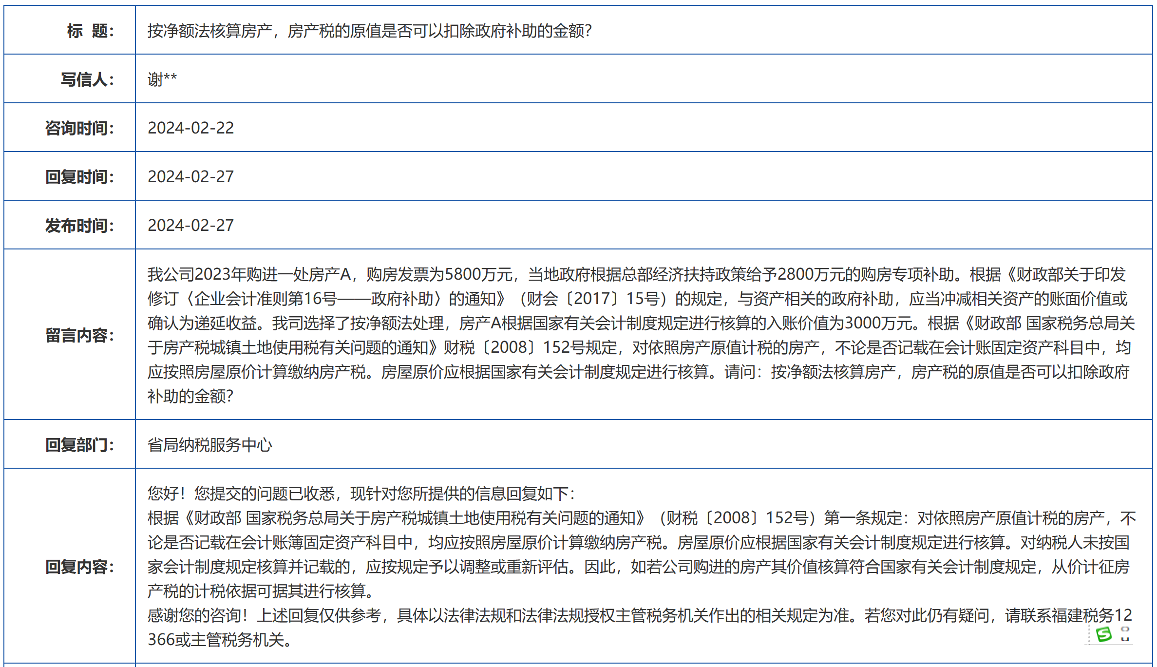 标 题: 按净额法核算房产,房产税的原值是否可以扣除政府补助的金额?