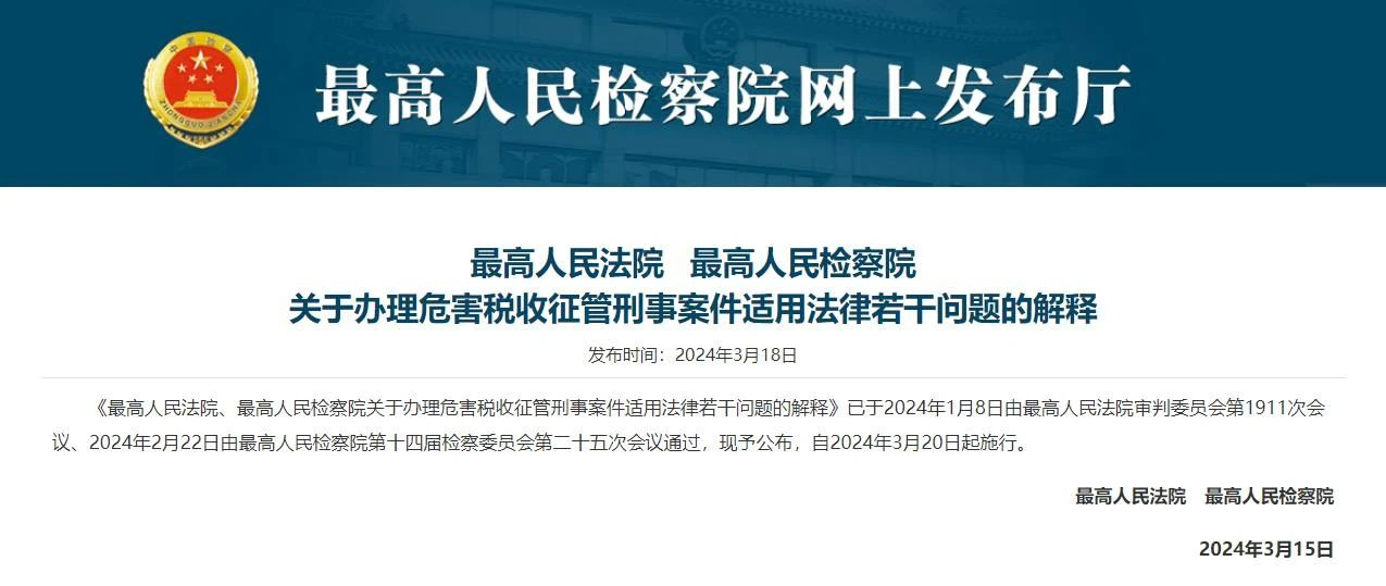 最高人民法院、最高人民检察院联合制定了《关于办理危害税收征管刑事案件适用法律若干问题的解释》,已于2024年1月8日由最高人民法院审判委员会第1911次会议、2024年2月22日由最高人民检察院第十四届检察委员会第二十五次会议通过,自2024年3月20日起施行。