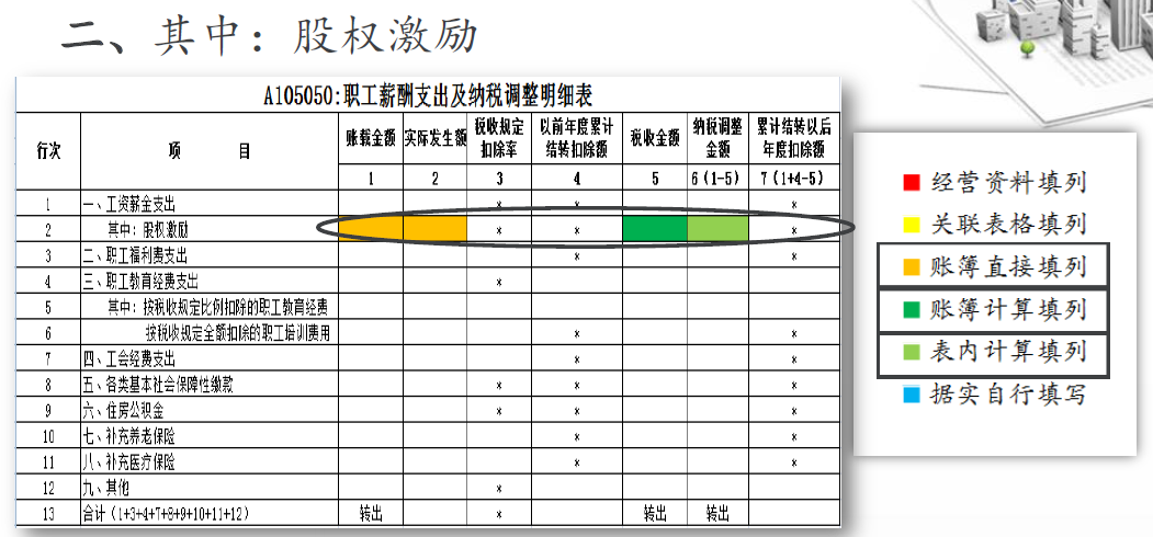 《职工薪酬纳税调整明细表》(A105050)第2行“其中:股权激励” 由执行《上市公司股权激励管理办法》(中国证券监督管理委员会令第126号)的纳税人填报。第1列“账载金额”填报纳税人按照国家有关规定建立职工股权激励计划,会计核算计入成本费用的金额;第2列“实际发生额” 填报纳税人根据本年实际行权时股权的公允价格与激励对象实际行权支付价格的差额和数量计算确定的金额。第5列“税收金额”填报行权时按照税法规定允许税前扣除的金额;第6列“纳税调整金额”为第1-5列的余额。