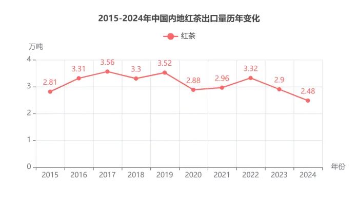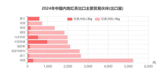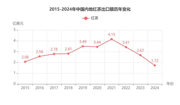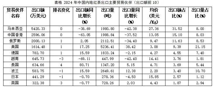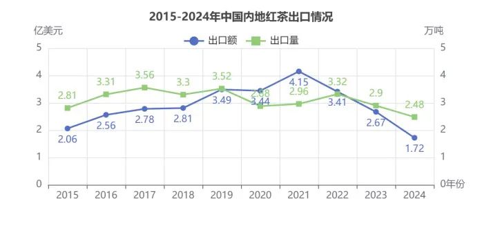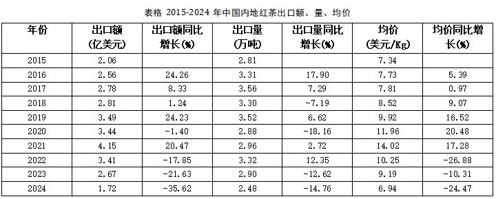 2024年中国内地红茶出口量2.48万吨,在各茶类排名第2,同比减少14.76%;出口额1.72亿美元,位列第2,同比减少35.62%;均价6.94美元/Kg,降幅24.47%。