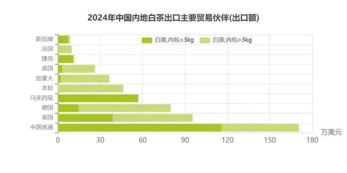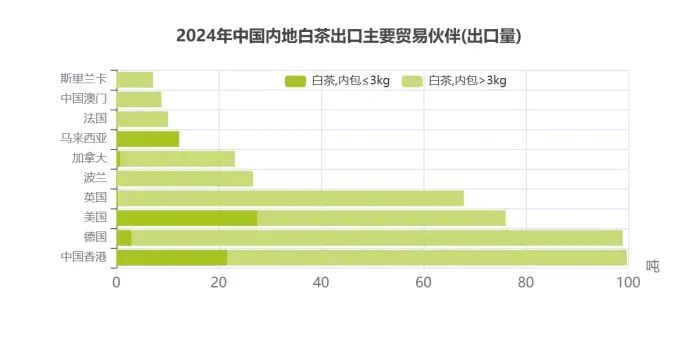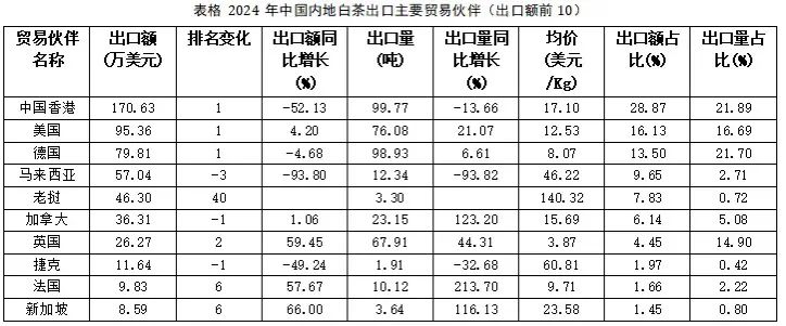 2024年中国内地白茶出口额前5贸易伙伴依次为中国香港 、美国 、德国 、马来西亚 、老挝,分别为出口额170.63万美元、出口额95.36万美元、出口额79.81万美元、出口额57.04万美元、出口额46.30万美元,合计占白茶出口规模的75.99%。出口量前5贸易伙伴依次为中国香港 、德国 、美国 、英国 、波兰,分别为出口量99.77吨、出口量98.93吨、出口量76.08吨、出口量67.91吨、出口量26.70吨,合计占白茶出口规模的63.71%。
