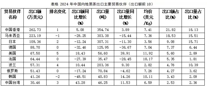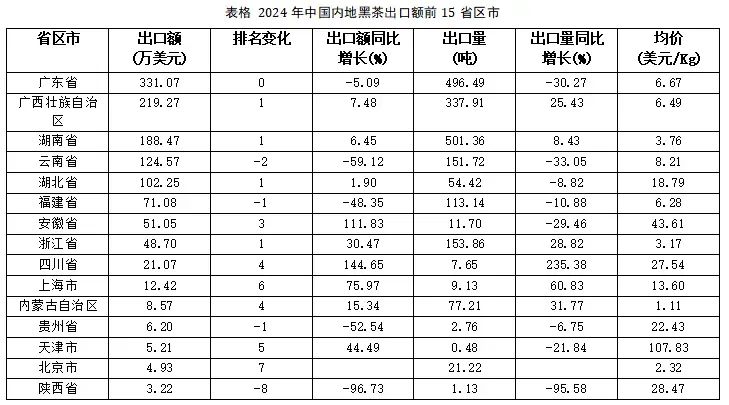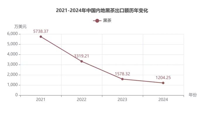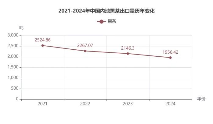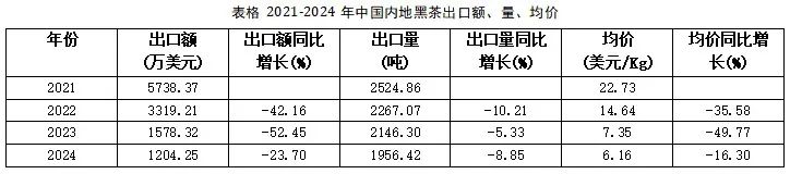 2024年中国内地黑茶出口量1956.42吨,在各茶类排名第5,同比减少8.85%;出口额1204.25万美元,位列第5,同比减少23.70%;均价6.16美元/Kg,降幅16.30%。