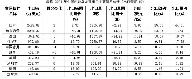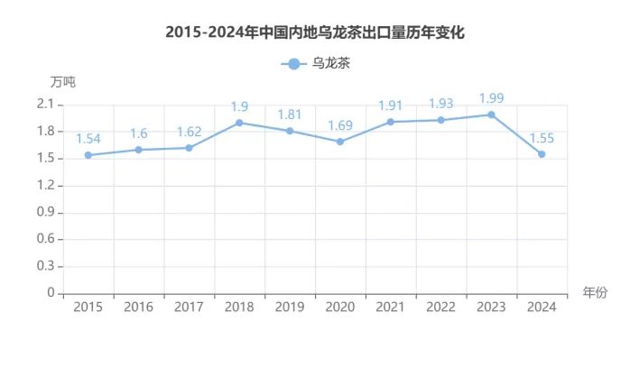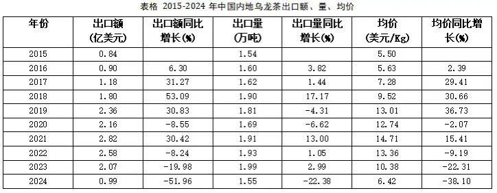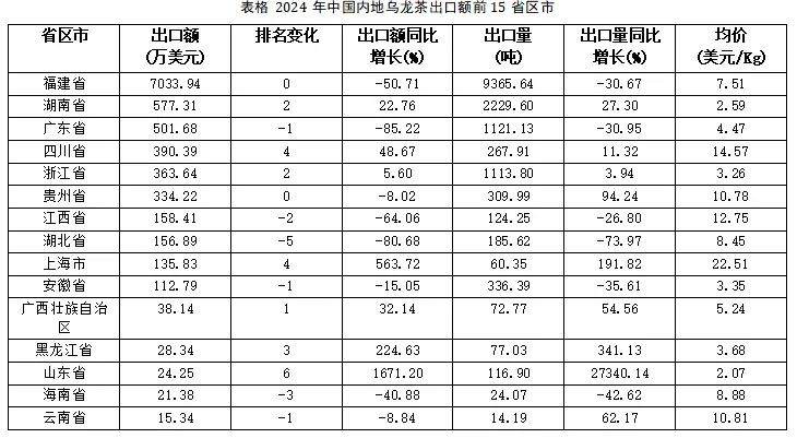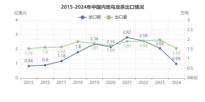 2024年中国内地乌龙茶出口量1.55万吨,在各茶类排名第3,同比减少22.38%;出口额9934.26万美元,位列第3,同比减少51.96%;均价6.42美元/Kg,降幅38.10%。