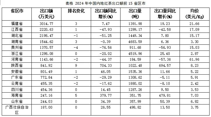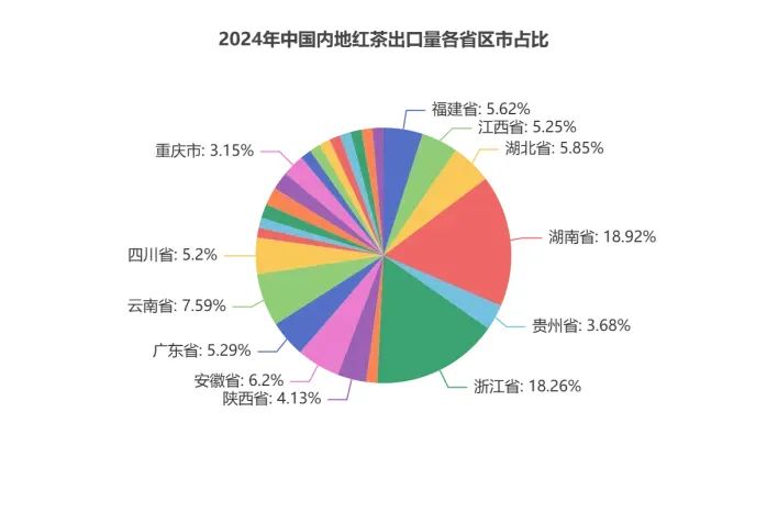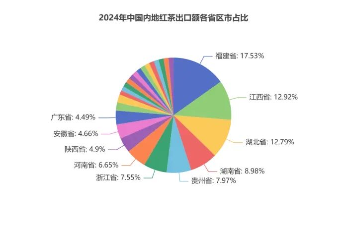 2024年红茶出口额前5省区市依次为福建省 、江西省 、湖北省 、湖南省 、贵州省,分别为出口额3014.77万美元、出口额2220.63万美元、出口额2198.47万美元、出口额1544.62万美元、出口额1370.57万美元,合计占红茶出口规模的60.19%。