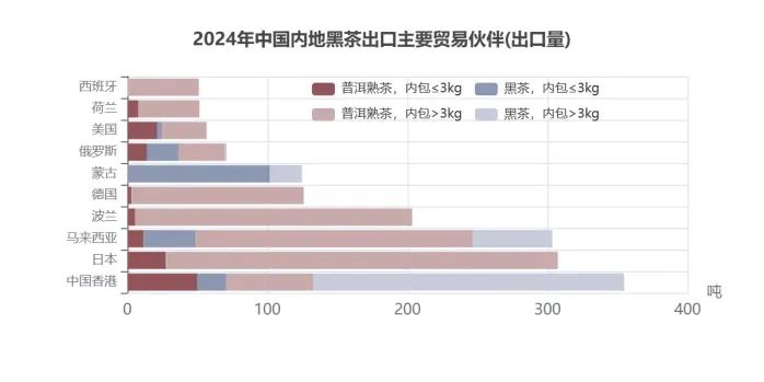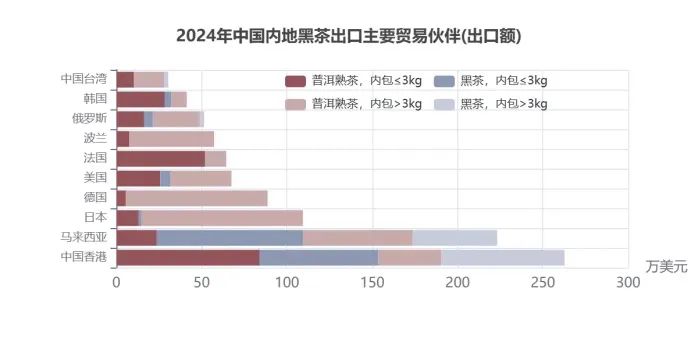 2024年中国内地黑茶出口额前5贸易伙伴依次为中国香港 、马来西亚 、日本 、德国 、美国,分别为出口额262.73万美元、出口额223.19万美元、出口额109.36万美元、出口额88.70万美元、出口额67.50万美元,合计占黑茶出口规模的62.40%。出口量前5贸易伙伴依次为中国香港 、日本 、马来西亚 、波兰 、德国,分别为出口量354.74吨、出口量307.31吨、出口量303.38吨、出口量203.37吨、出口量125.95吨,合计占黑茶出口规模的58.68%。