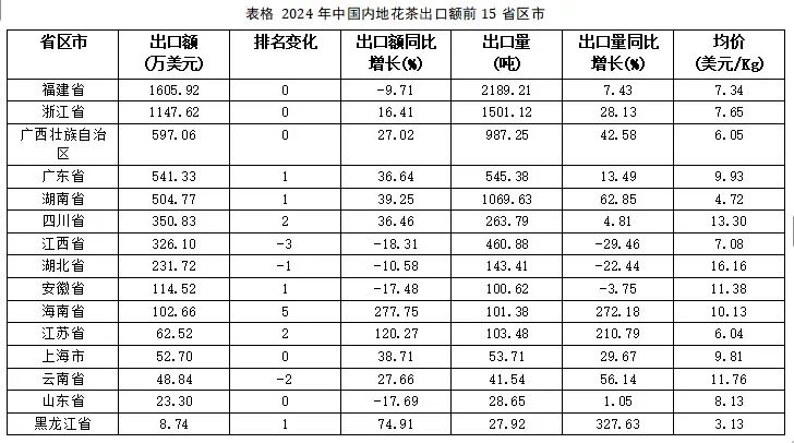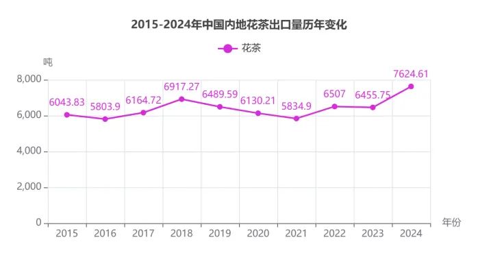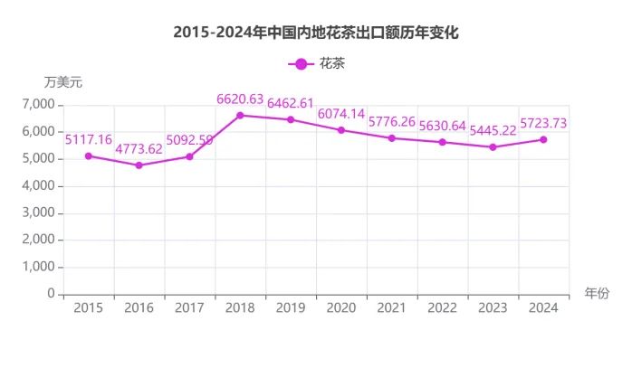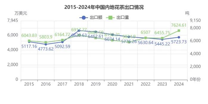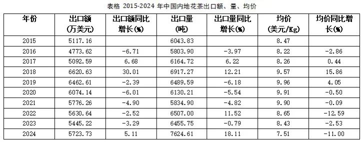2024年中国内地花茶出口量7624.61吨,在各茶类排名第4,同比增长18.11%;出口额5723.73万美元,位列第4,同比增长5.11%;均价7.51美元/Kg,降幅11.00%。