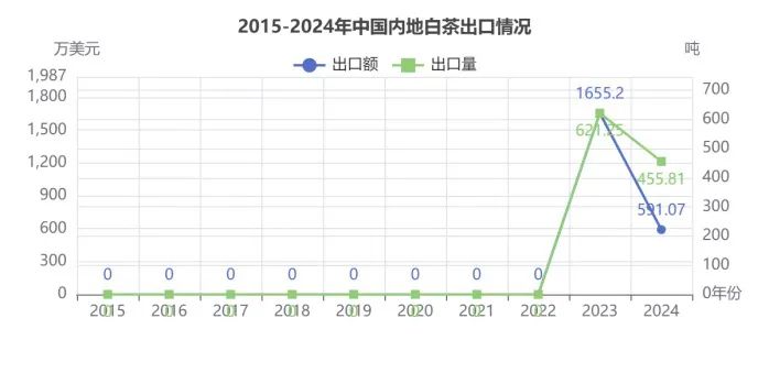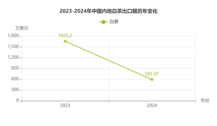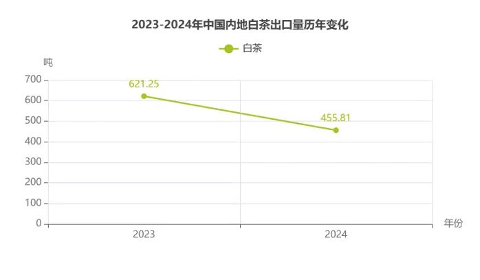 2024年中国内地白茶出口量455.81吨,在各茶类排名第6,同比减少26.63%;出口额591.07万美元,位列第6,同比减少64.29%;均价12.97美元/Kg,降幅51.33%。