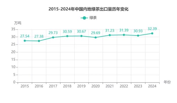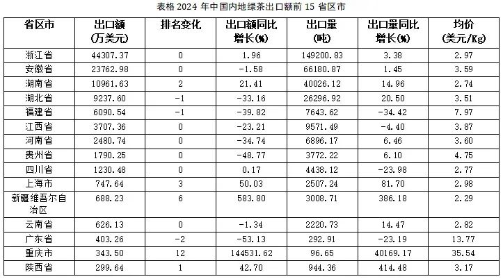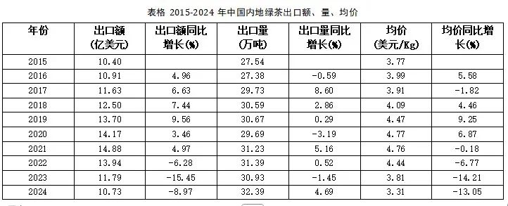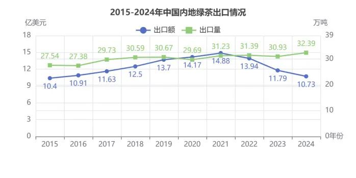 2024年中国内地绿茶出口量32.39万吨,在各茶类排名第1,同比增长4.69%;出口额10.73亿美元,位列第1,同比减少8.97%;均价3.31美元/Kg,降幅13.05%。