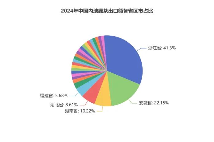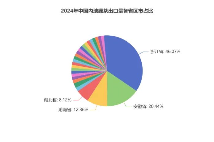 2024年绿茶出口额前5省区市依次为浙江省 、安徽省 、湖南省 、湖北省 、福建省,分别为出口额4.43亿美元、出口额2.38亿美元、出口额1.10亿美元、出口额9237.60万美元、出口额6090.54万美元,合计占绿茶出口规模的87.95%。