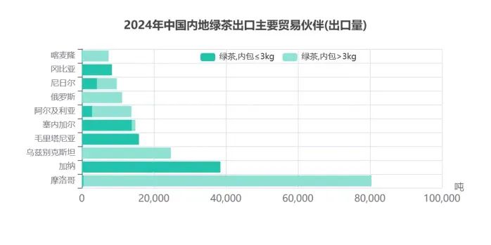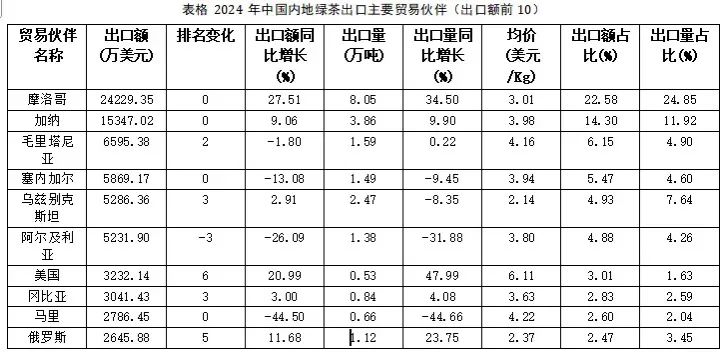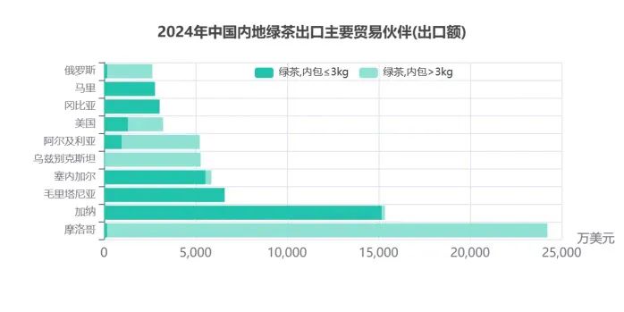 2024年中国内地绿茶出口额前5贸易伙伴依次为摩洛哥 、加纳 、毛里塔尼亚 、塞内加尔 、乌兹别克斯坦,分别为出口额2.42亿美元、出口额1.53亿美元、出口额6595.38万美元、出口额5869.17万美元、出口额5286.36万美元,合计占绿茶出口规模的53.43%。出口量前5贸易伙伴依次为摩洛哥 、加纳 、乌兹别克斯坦 、毛里塔尼亚 、塞内加尔,分别为出口量8.05万吨、出口量3.86万吨、出口量2.47万吨、出口量1.59万吨、出口量1.49万吨,合计占绿茶出口规模的53.89%。