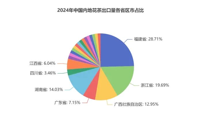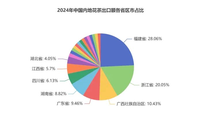 2024年花茶出口额前5省区市依次为福建省 、浙江省 、广西壮族自治区 、广东省 、湖南省,分别为出口额1605.92万美元、出口额1147.62万美元、出口额597.06万美元、出口额541.33万美元、出口额504.77万美元,合计占花茶出口规模的76.82%。