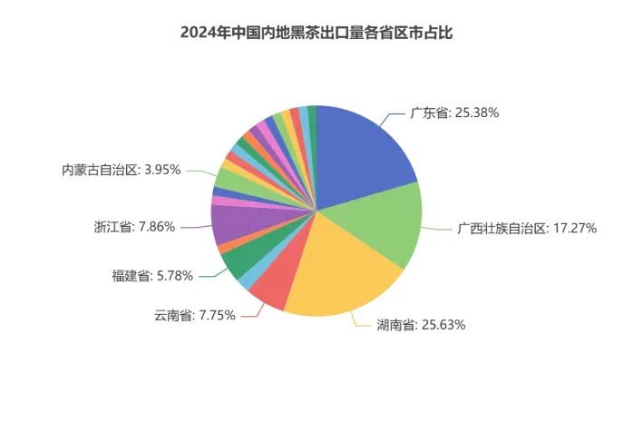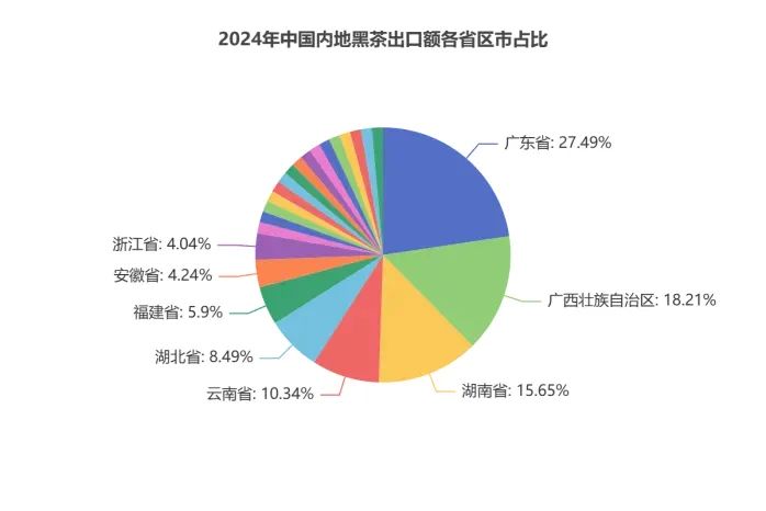 2024年黑茶出口额前5省区市依次为广东省 、广西壮族自治区 、湖南省 、云南省 、湖北省,分别为出口额331.07万美元、出口额219.27万美元、出口额188.47万美元、出口额124.57万美元、出口额102.25万美元,合计占黑茶出口规模的80.19%。