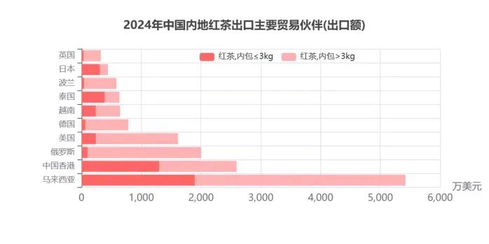 2024年中国内地红茶出口额前5贸易伙伴依次为马来西亚 、中国香港 、俄罗斯 、美国 、德国,分别为出口额5420.33万美元、出口额2596.06万美元、出口额2000.13万美元、出口额1614.48万美元、出口额782.70万美元,合计占红茶出口规模的72.20%。出口量前5贸易伙伴依次为美国 、波兰 、哈萨克斯坦 、俄罗斯 、中国香港,分别为出口量5236.41吨、出口量2649.61吨、出口量2587.52吨、出口量2112.51吨、出口量1988.84吨,合计占红茶出口规模的53.12%。