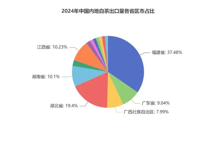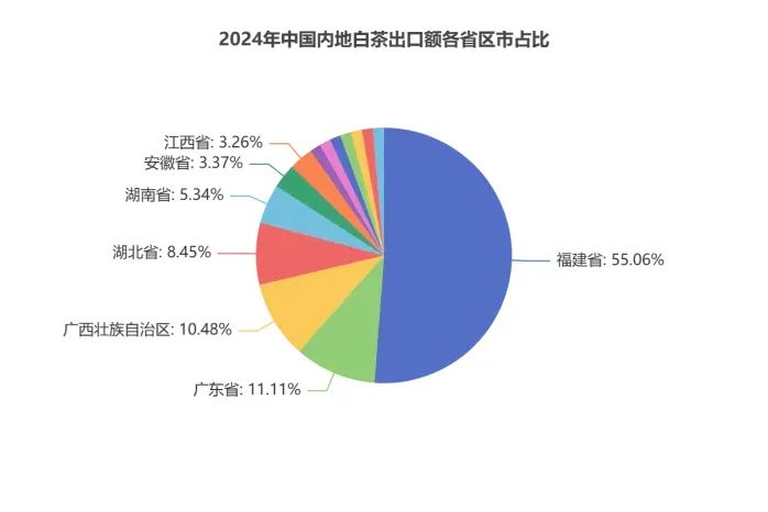 2024年白茶出口额前5省区市依次为福建省 、广东省 、广西壮族自治区 、湖北省 、湖南省,分别为出口额325.44万美元、出口额65.68万美元、出口额61.96万美元、出口额49.94万美元、出口额31.58万美元,合计占白茶出口规模的90.45%。