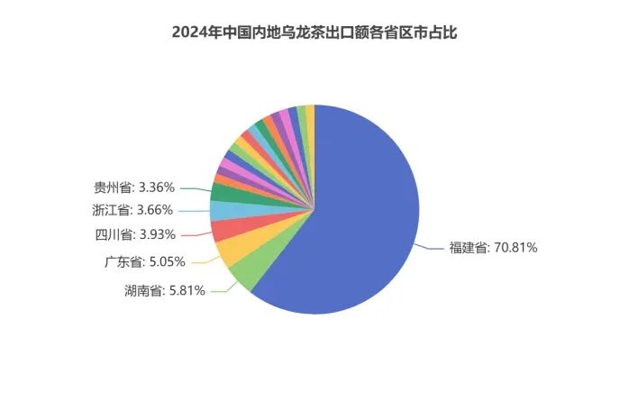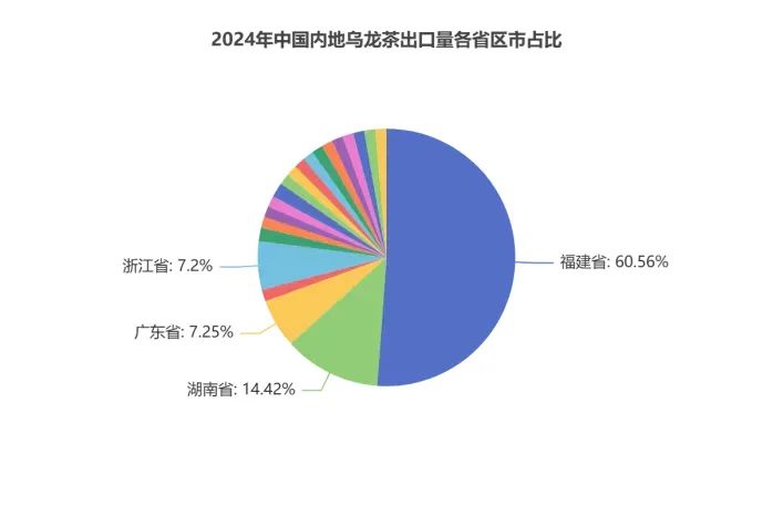 2024年乌龙茶出口额前5省区市依次为福建省 、湖南省 、广东省 、四川省 、浙江省,分别为出口额7033.94万美元、出口额577.31万美元、出口额501.68万美元、出口额390.39万美元、出口额363.64万美元,合计占乌龙茶出口规模的89.26%。
