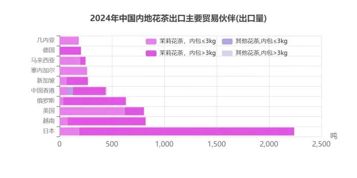 2024年中国内地花茶出口额前5贸易伙伴依次为日本 、美国 、越南 、中国香港 、马来西亚,分别为出口额1643.06万美元、出口额812.75万美元、出口额538.17万美元、出口额381.10万美元、出口额329.13万美元,合计占花茶出口规模的64.72%。出口量前5贸易伙伴依次为日本 、越南 、美国 、俄罗斯 、中国香港,分别为出口量2241.44吨、出口量822.17吨、出口量808.08吨、出口量634.52吨、出口量453.11吨,合计占花茶出口规模的59.99%。