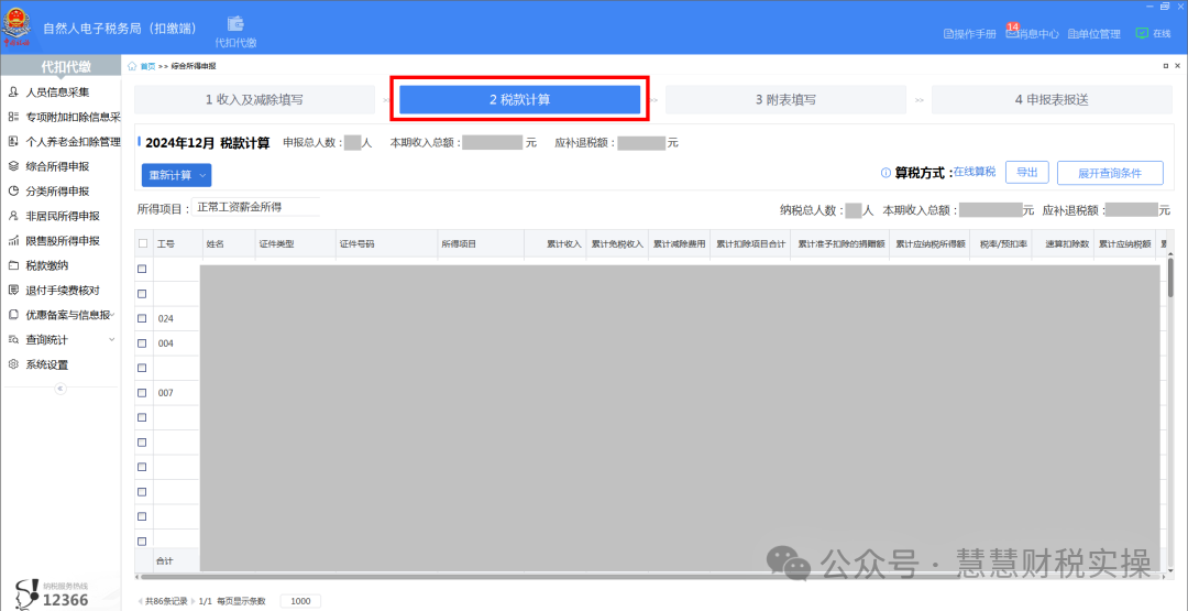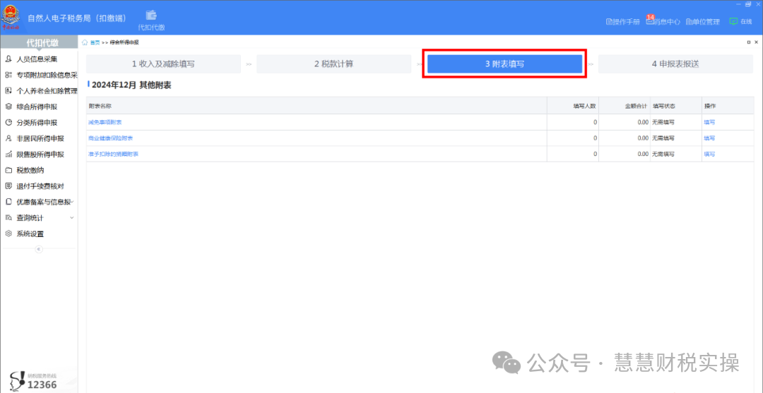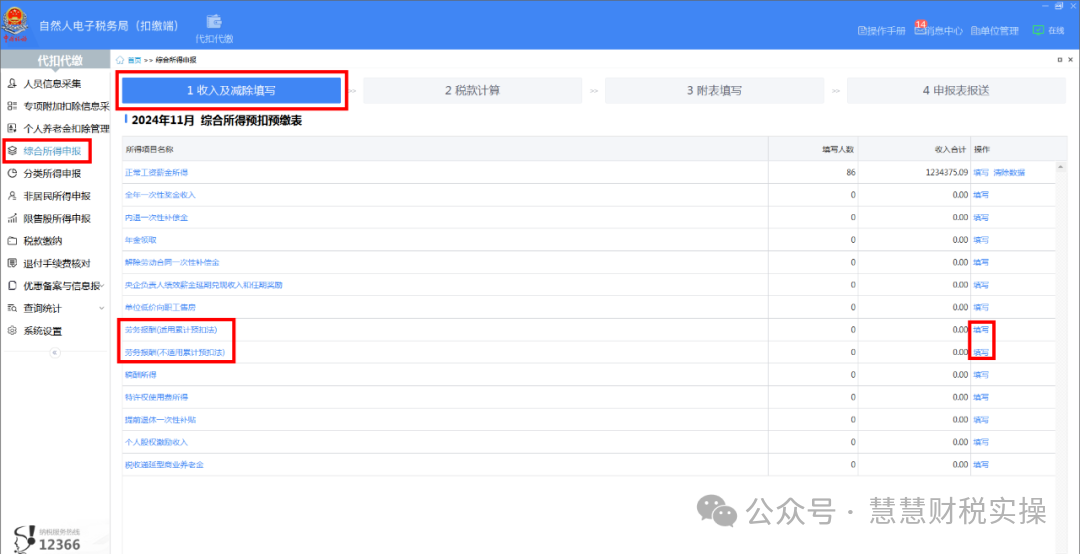 2.左侧点击【综合所得申报】,实际情况选择“劳务报酬(适用累计预扣法)”或者“劳务报酬(不适用累计预扣法)”,点击右方【填写】,通过【添加】录入纳税人劳务报酬相关信息,点击【保存】。