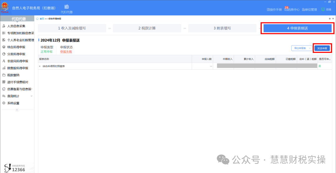 4.点击进入【4 申报表报送】模块,核实申报表报送数据,确认无误后,点击【发送申报】。