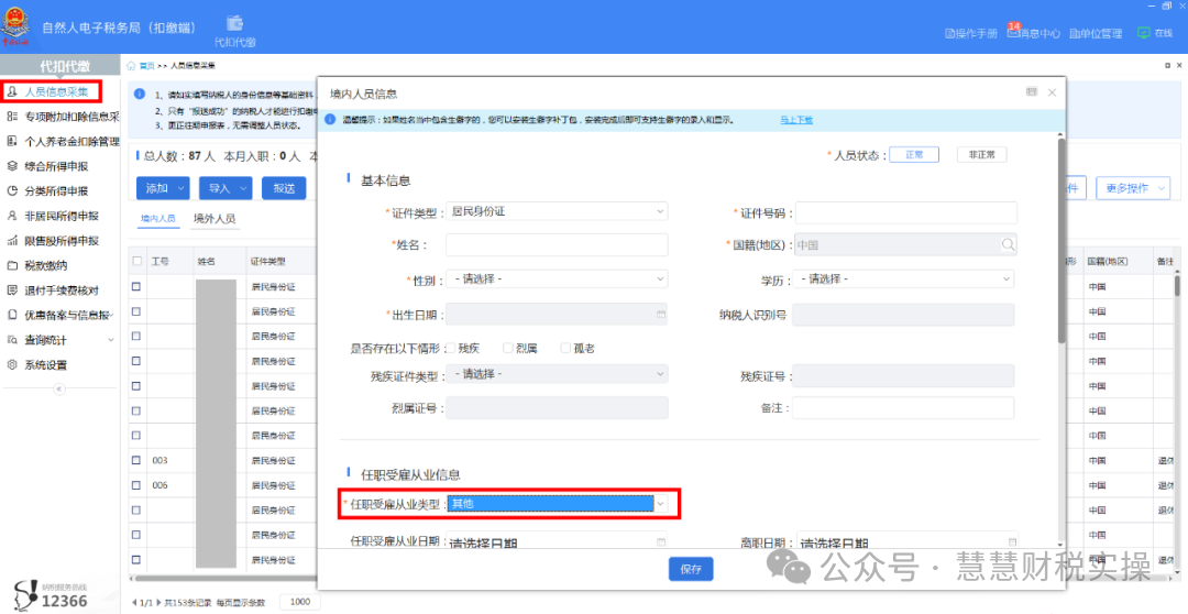 1.登录自然人电子税务局(扣缴端),点击【人员信息采集】-【添加】,输入纳税人基本信息,在“任职受雇从业类型”栏选择“其他”,完善相关信息后,点击【保存】并【报送】。