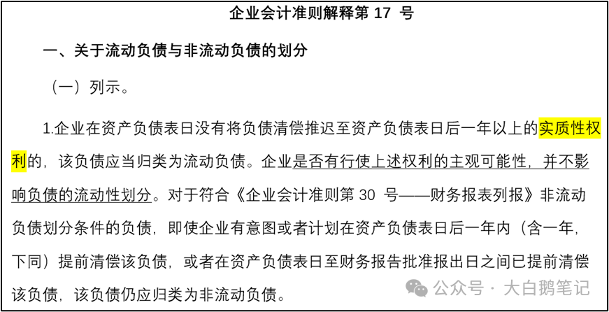 该权利直接影响负债是否满足非流动负债的分类条件(如推迟清偿的能力)。 注:企业会计准则解释第17 号相关原文如下: