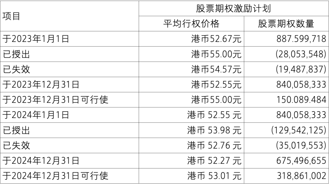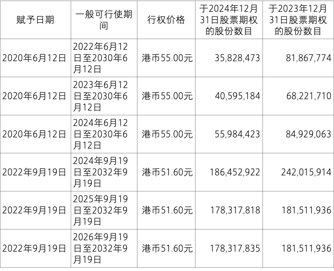 于 2020 年 6 月 12 日(“第一期授予”),本公司董事会根据股东大会的授权,批准向 9,914 位股票期权激励计划合格参与者授予共计 305,601,702 股本公司的股票期权,占本公司授予日届时已发行股本的 1.5%。行权价格为每股港币 55.00 元。