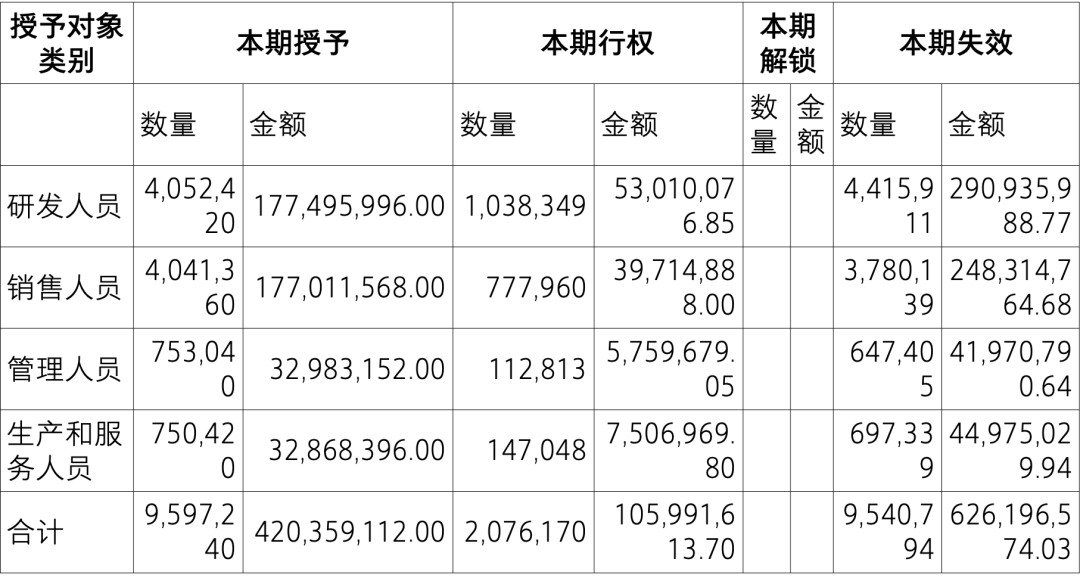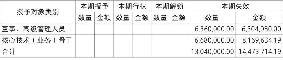 第六十一条 公司应按授予对象类别披露本期授予、行权、解锁和失效的各项权益工具数量和金额,期末发行在外的股票期权或其他权益工具行权价格的范围和合同剩余期限。