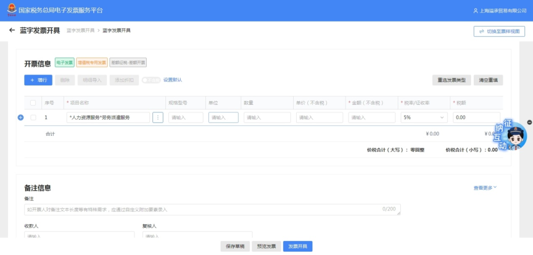 3.填写购买方信息后,录入或选择项目开票名称“人力资源服务*劳务派遣服务”,自动弹出扣除项填写界面。