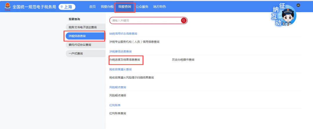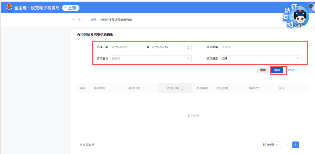 提交成功后,等待税务机关审批。可以通过电子税务局【我要查询】-【涉税信息查询】-【涉税事项进度查询】-【办税进度及结果信息查询】模块,设置筛选条件,查询到该条申请后可以查看办理进度。