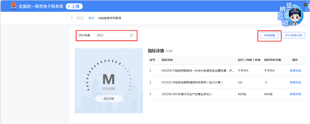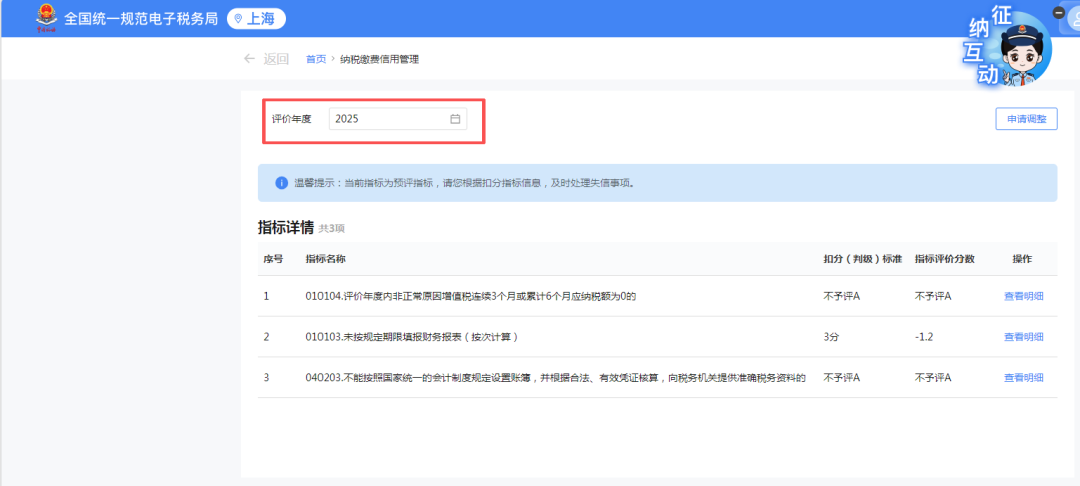 进入纳税缴费信用管理模块后,切换【评价年度】,可以查看不同年度的纳税缴费信用评价情况和扣分明细。若存在可修复的指标,可以点击【申请调整】。