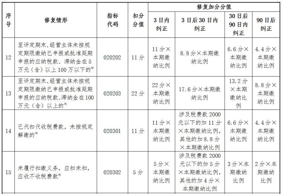 附件6第10-15项引入了渐次修复机制,根据补缴税费款占比和补缴及时性,综合计算修复加分(如3日内补缴的按补缴比例*100%修复扣分分值、30日内补缴的按补缴比例*80%修复扣分分值)。