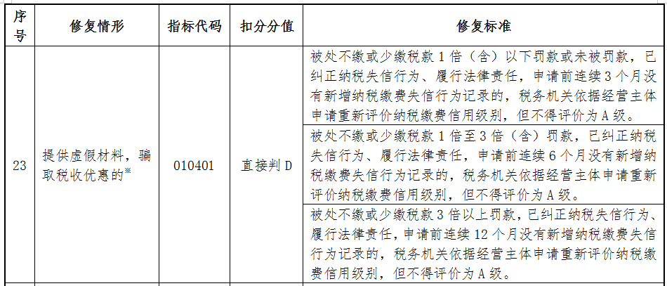 附件6第23-32项进一步细化直接判D指标的修复条件,根据偷税金额、罚款倍数、罚款金额、补缴时间等要素,将信用修复“等待”时长分为3个月、6个月和12个月3档。其中,没有新增纳税缴费失信行为记录从经营主体直接判为D级起开始计算,经营主体直接判为D级后再次出现其他纳税缴费失信行为记录的,该时间需重新计算;第32项中,经营主体在被认定为重大税收违法失信主体前,已因相同失信行为被直接判D的,该时间从具体失信行为导致直接判为D级起开始计算。