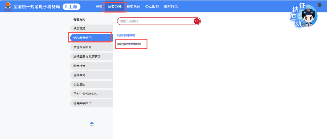 登录电子税务局后,点击【我要办税】-【纳税缴费信用】-【纳税缴费信用管理】。