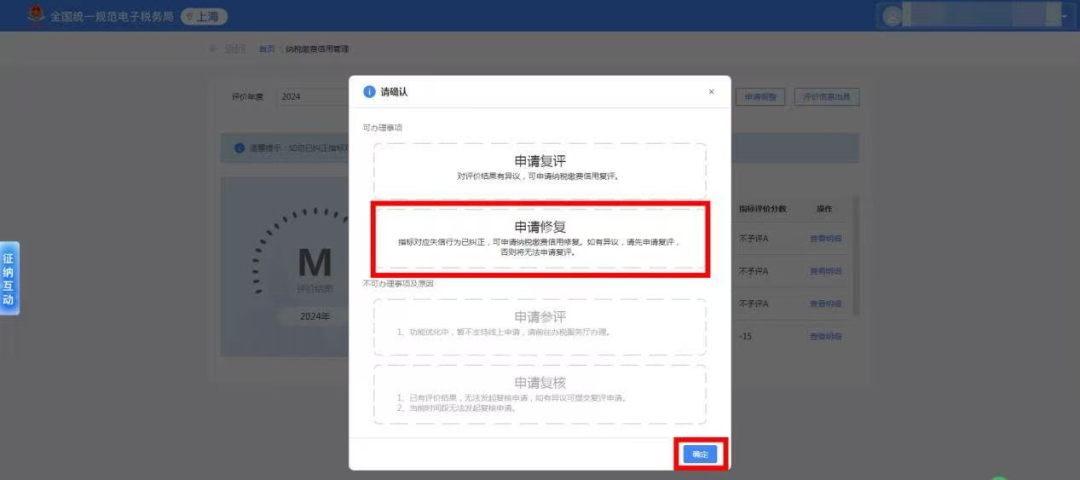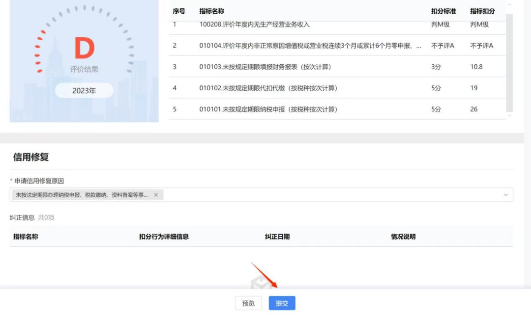 系统会根据当前年度的信用评价情况,自动推荐可办理业务,符合修复条件的,点击【申请修复】,选择修复原因后,提交申请。