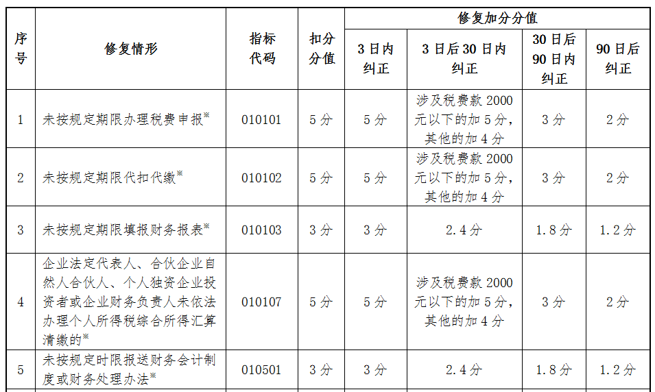 附件6第1-21项新增了一档信用修复标准,即失信行为发生后3日内纠正的,可按100%修复原扣分分值。同时,适当提高了原有修复标准的加分比例,由原来的挽回80%、40%、20%的扣分损失调整为挽回80%、60%、40%的扣分损失。