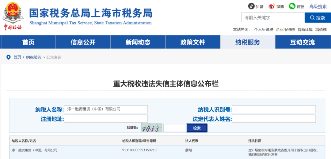 国家税务总局上海市税务机关第五稽查局检查发现,案涉公司添一融资租赁(中国)有限公司主要存在以下问题:为他人(为自己)开具与实际经营业务不符的增值税专用发票150份,金额14769.17万元,税额2510.76万元。依据《税收征收管理法》等法律法规,税务机关依法将案件移送司法机关。