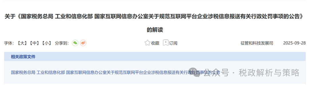 为落实《互联网平台企业涉税信息报送规定》(以下简称《规定》),国家税务总局、工业和信息化部、国家互联网信息办公室联合制发《关于规范互联网平台企业涉税信息报送有关行政处罚事项的公告》(2025年第22号)(以下简称《公告》)。现解读如下: