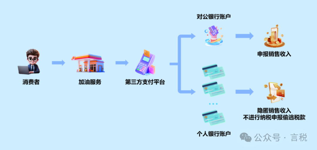 检查人员逐笔梳理第三方支付平台的交易流水,结合该加油站对公账户银行流水和申报数据,锁定与销售收入相关的资金,查实隐匿销售收入达1085.75万元。面对事实证据,该加油站负责人最终承认相关违法行为的事实:为少申报纳税,其通过使用第三方收款平台收取加油款,结算后转至个人银行账户,款项未进入对公账户申报纳税。该加油站负责人表示积极配合税务机关检查工作,如实提供相关证据资料。