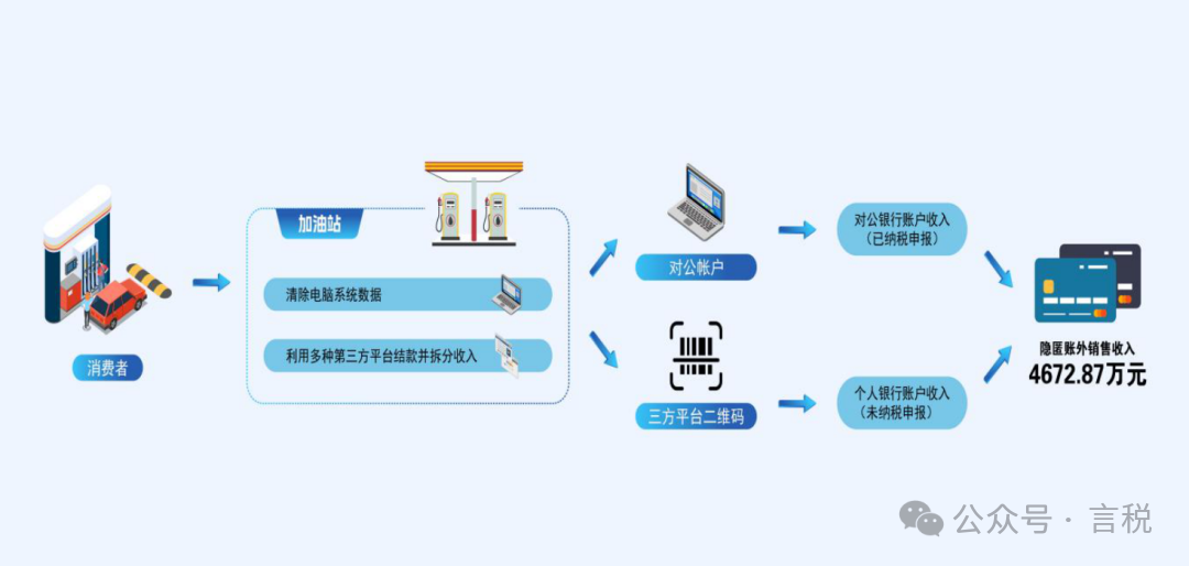 面对证据,李长龙仍狡辩称是亲属间借款。检查人员依法调取相关人员账户流水,再次比对支付时间、金额分布等数据,结合相关证据,查实该加油站对公银行账户收款按规定正常申报纳税,而平台收款码收取的大部分加油款则未进行申报纳税,共计隐匿销售收入4672.87万元。