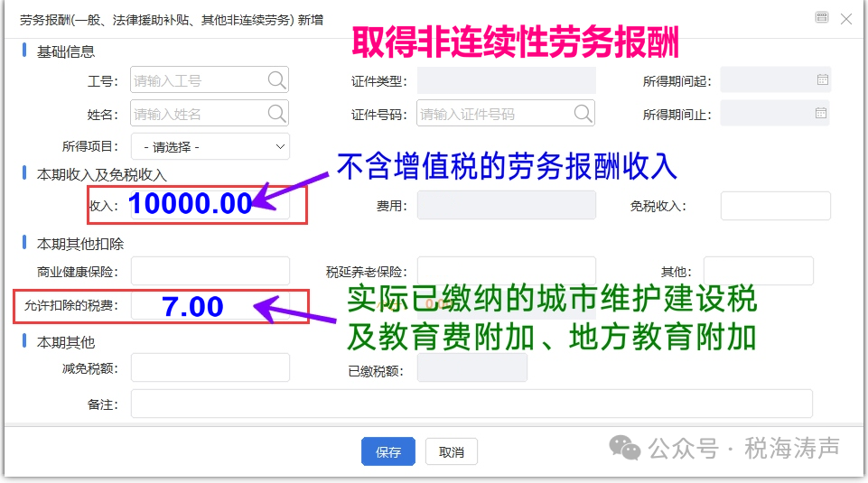 总结:对个人取得劳务报酬,以不含增值税的收入扣除费用(800元;收入×20%)后的余额为收入额,再扣除实际缴纳的附加税费,若属于连续性劳务报酬所得的还可以减除按照“5000元/月×当年截至本月月份数”计算的累计减除费用,减除其他允许扣除的项目(如有),然后依照税法有关规定计算征收(预扣预缴)个人所得税。