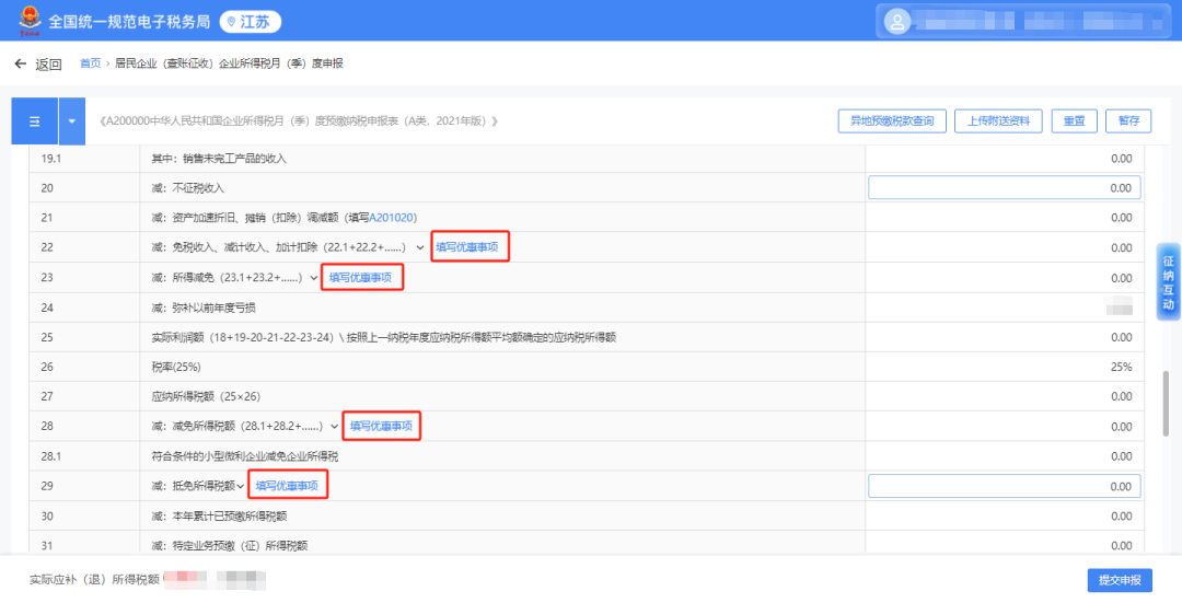 若存在免税收入、减计收入、加计扣除,所得减免,减免所得税额或抵免所得税额情形,可点击主表第22、23、28、29栏的【填写优惠事项】,进行勾选和填写。