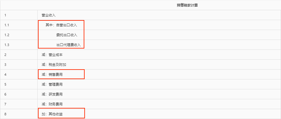 参照年度纳税申报表优化思路,根据最新财务报表样式增加“销售费用”“其他收益”等项目。同时,在“营业收入”项目下增加“自营出口收入”“委托出口收入”“出口代理费收入”等项目,由涉及出口业务的企业填报。