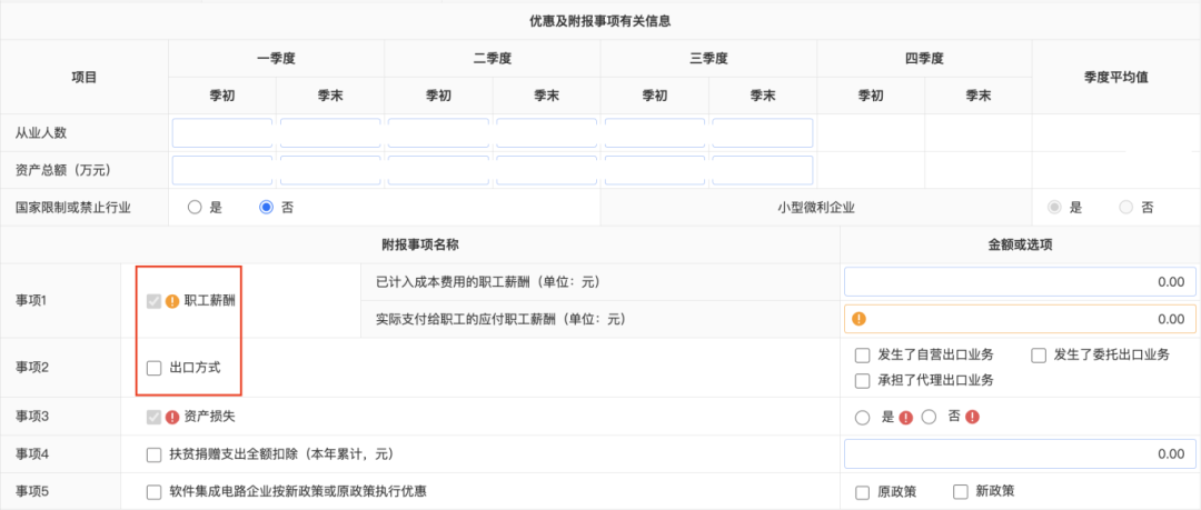 在“优惠及附报事项有关信息”部分增加“职工薪酬”和“出口方式”项目,发生相关事项的纳税人应准确填报有关情况。