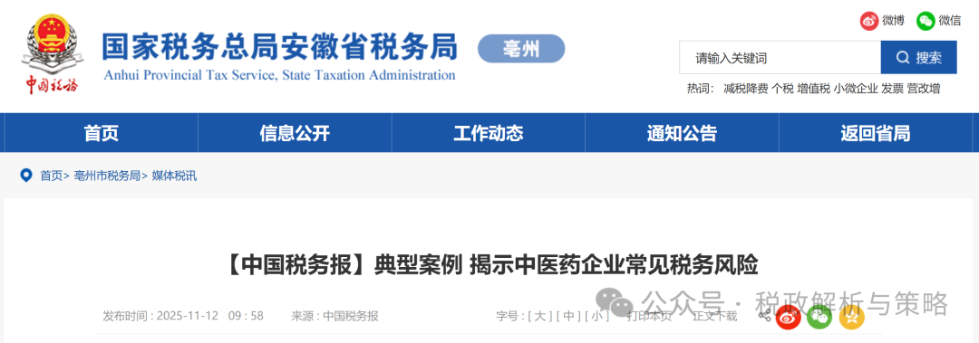 (许蒙亚)安徽省亳州市素有“中华药都”之称。截至目前,亳州市共有各类中医药企业8000余家,拥有全国唯一的国家级中药材检验检测中心和中药材技术性贸易措施研究评议基地。据统计,2024年,亳州市中药材种植面积127.1万亩,产值47.64亿元,其中标准化种植面积50.07万亩,增长8.52%;现代中医药产业规模达2102.6亿元,增长11.9%;其中,规上医药制造业产值502亿元、增长10.9%。在此背景下,国家税务总局亳州市税务局组建服务中医药产业高质量发展工作专班,印制了《支持中医药产业高质量发展税费优惠政策指引》,提醒企业在生产经营过程中可能面临的税务风险,梳理形成了一批典型案例。