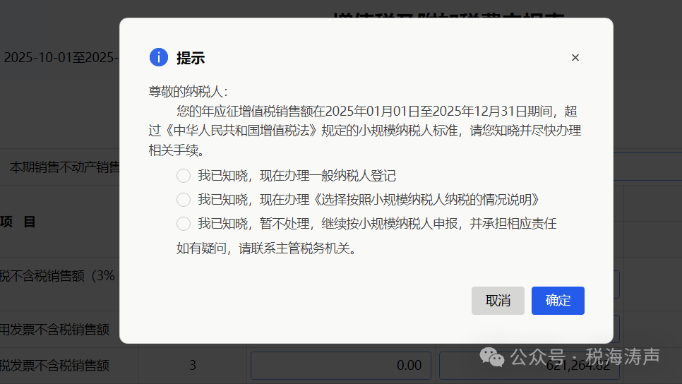 最后,再次提醒:鉴于自2026年开始施行的一般纳税人登记管理新政规定,小规模纳税人的年应征增值税销售额超过规定标准的,其一般纳税人的生效之日为超过规定标准的当期1日(即超标当月或当季的1日),而非办理一般纳税人登记的时候,小规模纳税人在依法依规申报纳税的同时,切实注意防范涉税风险。