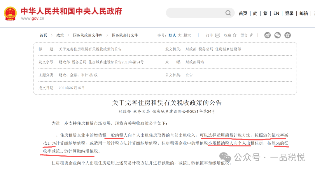 2.对住房租赁企业(小规模纳税人)适用简易计税方法的,按照3%的征收率减按1.5%征收增值税;---这一条和之前的政策是不一致的,原政策是按5%的征收率减按1.5%计算。