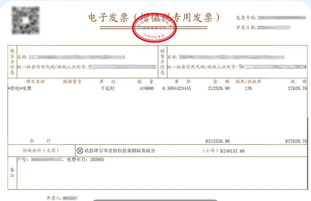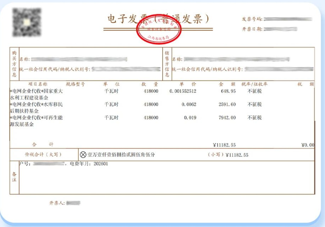 3.自2026年1月电费账期起,电费发票中的电费、政府性基金拆分为两个项目,对应税率栏标准分别为13%、不征税。