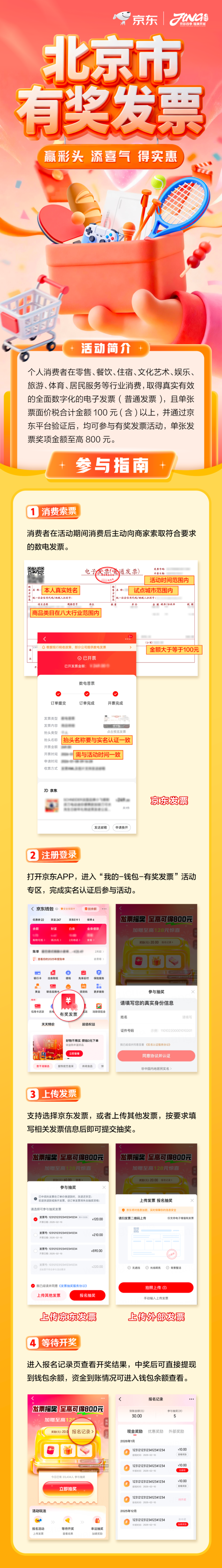 以北京为例,北京有奖发票参与可通过银联云闪付、支付宝、微信支付、京东支付、抖音支付等渠道,进入“有奖发票”页面或小程序,然后在活动页面上传发票信息就能参与抽奖。最高奖金800元,还有200、100、50、10元不等奖金,奖金以电子红包形式在10个工作日内兑付至参与渠道的个人支付账户,可随心消费。