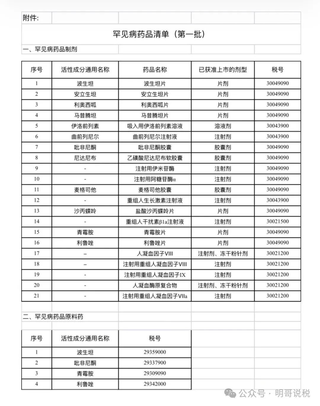 四、本通知所称罕见病药品,是指经国家药品监督管理部门批准注册的罕见病药品制剂及原料药。罕见病药品清单(第一批)见附件。罕见病药品范围实行动态调整,由财政部、海关总署、税务总局、药监局根据变化情况适时明确。