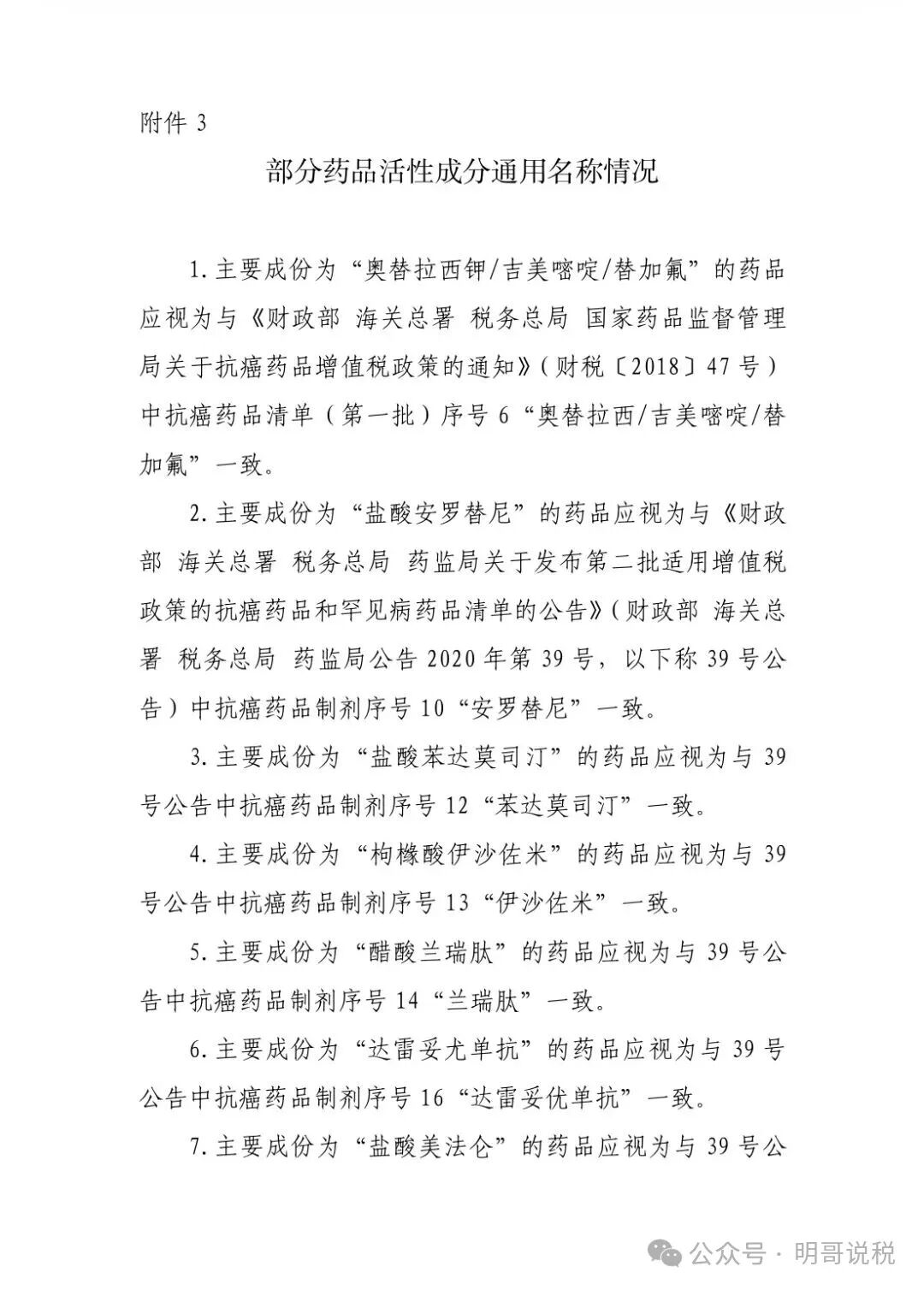 四、本公告附件3所列药品应视为与《财政部 海关总署 税务总局 国家药品监督管理局关于抗癌药品增值税政策的通知》(财税〔2018〕47号)、《财政部 海关总署 税务总局 药监局关于发布第二批适用增值税政策的抗癌药品和罕见病药品清单的公告》(财政部 海关总署 税务总局 药监局公告2020年第39号)所附清单中对应药品活性成分名称/活性成分通用名称一致,并按上述政策规定的实施日期及要求执行相关增值税政策。