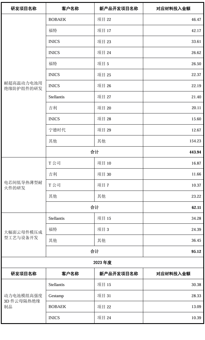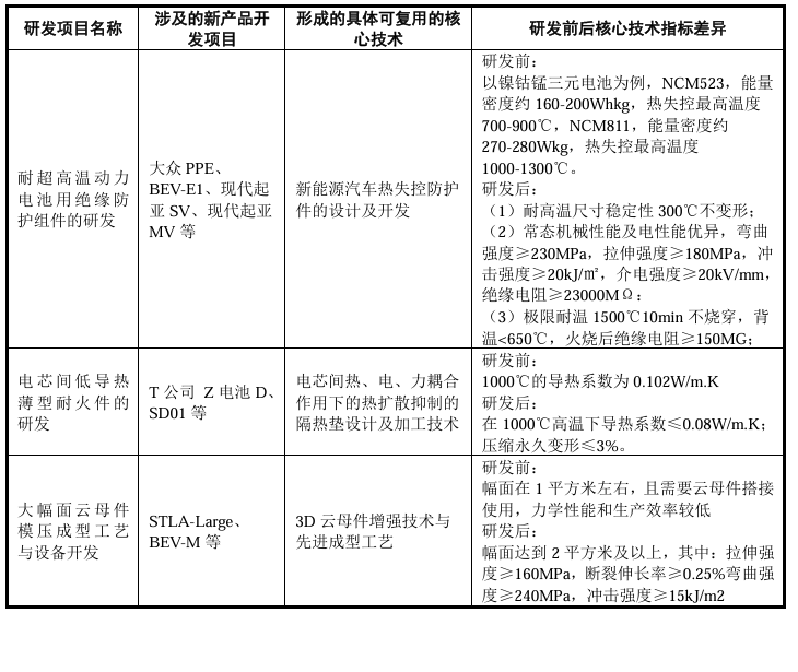 2、结合各新产品开发形成的具体可复用技术、研发前后的核心技术指标差异等,说明新产品开发支出计入研发费用的合理性、相关会计处理是否符合《企业会计准则》的规定报告期内,发行人聚焦新能源汽车动力电池热失控防护材料的技术升级与产品创新,核心围绕耐高温性、抗冲击性及抗撕裂强度等极端工况关键性能指标开展研发工作,以匹配下游客户对电池包安全防护日趋严苛的技术要求。